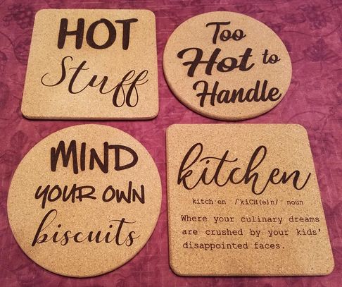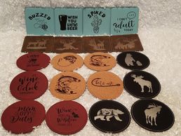 4" Leatherette or Cork Coasters in round or square shapes with stitched edge.